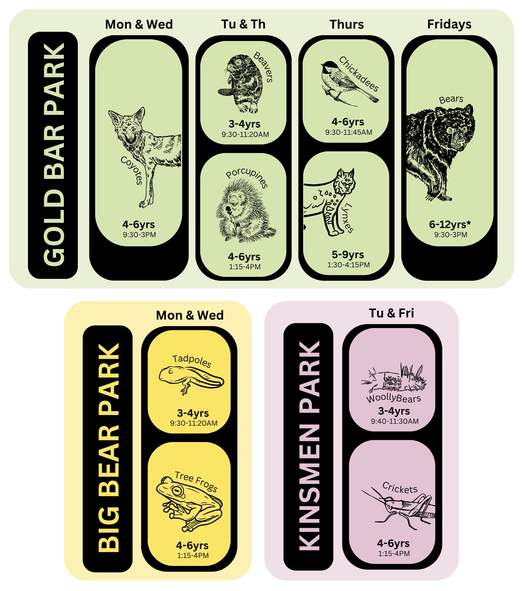 This program encourages more complex imagining and bigger physical movements through the park. Children tackle more intricate ideas and wider explorations, growing their independence and resilience as they navigate the forest's shifting seasons.